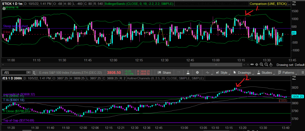 Here’s an example of a TICK extreme (red number 1 on the top chart) and the simultaneous price reversal of the ES (red number 2 on the bottom chart):